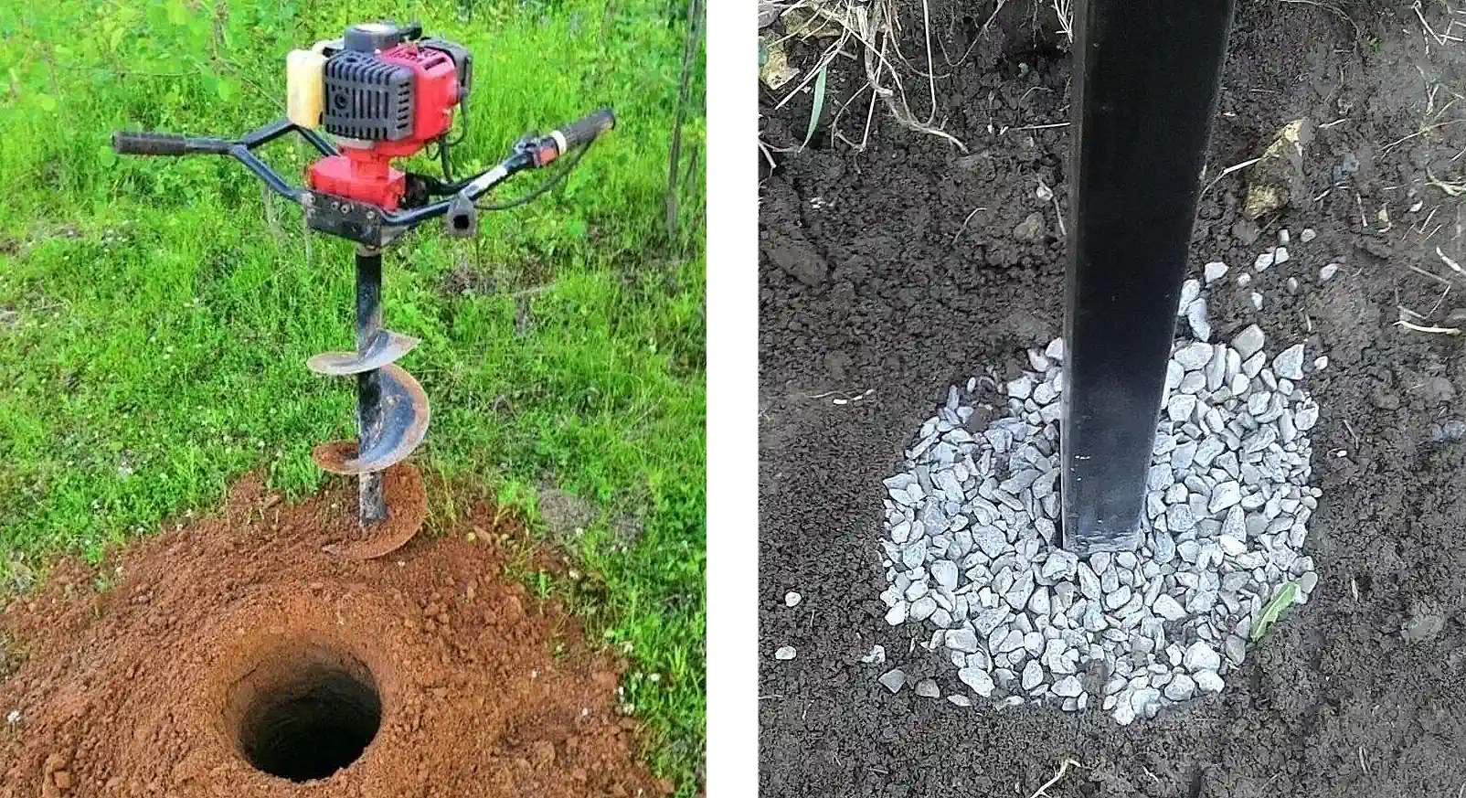 Когда все геодезические работы произведены, производится бурение отверстий на глубину 0,8 метра . Для этого используется бензобур с диаметром шнека 200мм. Бурение бензобуром дает ровное, не разрыхленное отверстие в земле.
